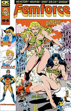 Femforce is a comic book published by AC Comics that began publication in 1985, detailing the adventures of the titular team: the "Federal Emergency Missions Force" or "Femforce", some of them original creations, while others originated in the 1940s and 50s, lapsing into public domain by the time Femforce was published. The team are, as their name implies, all female superheroes, and are the first and the longest running all-women 'super-team'. The series has passed 150 issues, a significant milestone for an independent comic book company. Writers on the book have included Bill Black, Stephanie Sanderson, Mark Heike, Paul Monsky, Enrico Teodorani and Francesca Paolucci. Artists on the book have included Bill Black, Stephanie Sanderson, Mark Heike, Brad Gorby, Jeff Austin and Rik Levins.