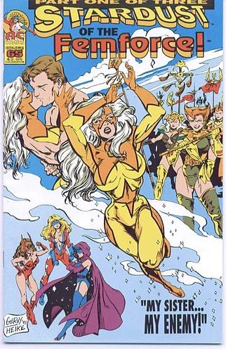 Stardust decided to return to planet Earth after defeating the Kronons to study its civilization. The humans' diverse cultures had fascinated her during her first visit. Stardust would soon be at Paragon’s side as his protege and would begin to learn to adapt to her new home. Soon after her arrival she and Paragon were both faced with the oncoming threat of the human turncoat Chromo and the reptilian Vardax invasion. Being notified by another alien faring from the planet Altrann, Commando D and his young friend Denny Brant, the mistress of magic Nightveil, and the smart mouthed Scarlet Scorpion also joined the fight against the invading forces of the alien shape-shifters called the Vardax. The five heroes united their collective might and fought together to repel the invaders plans to infiltrate many government agencies and take over Earth. Stardust and the other heroes soon defeated Chromo and the Vardax and decided to form a watch group of heroes, the Sentinels of Justice were born. The team next faced the mystery of Paragon’s true origin but the heroes, while remaining friends, largely stopped working as a team when both Stardust and Nightveil were asked to join the United States of America's government sanctioned Femforce.